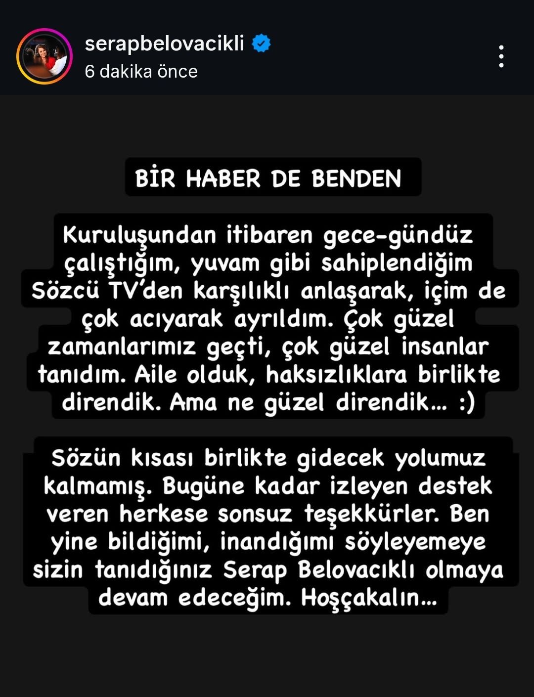 Serap Belovacıklı Sözcü TV’den ayrıldığını / istifa ettiğini 29 Aralık 2025’te saat 14:00 civarında instagram hesabından aşağıdaki sözlerle duyurdu: